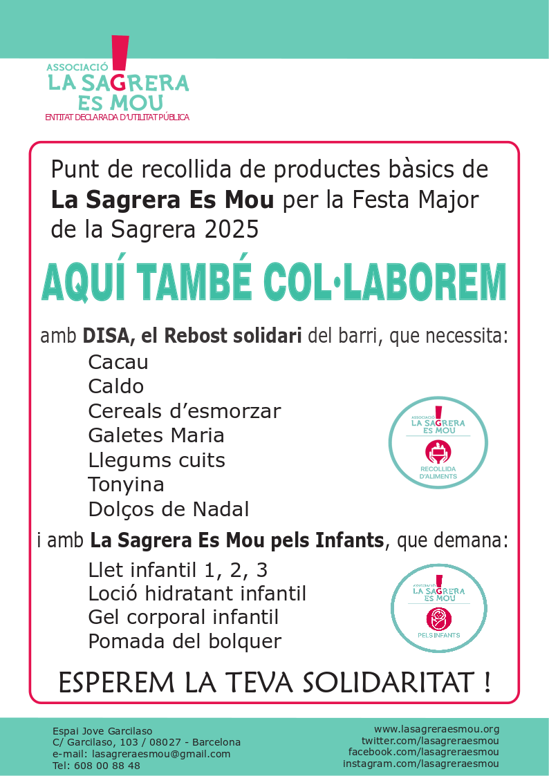 Campanya de recollida a les escoles + Afegir a Google Calendar Exportació a + iCal / Outlook Data 12 - 25 nov. 2025 Hora 09:00 - 16:00 Categories Activitats Organitza LSEM Recollida d'Aliments Web https://lasagreraesmou.org/que-fem/cooperacio/recollida-daliments/
