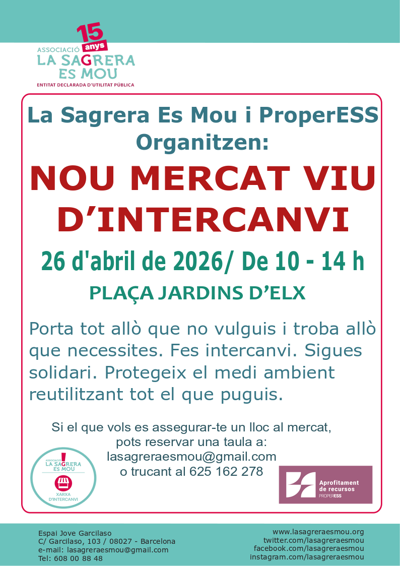 Mercat d’intercanvi + Afegir a Google Calendar Exportació a + iCal / Outlook Data 26 abr. 2026 Hora 10:00 - 14:00 Lloc Plaça dels Jardins d'Elx Plaça dels Jardins d'Elx Categories Activitats Organitza Xarxa d'Intercanvi Web https://lasagreraesmou.org/que-fem/cooperacio/xarxa-dintercanvi/