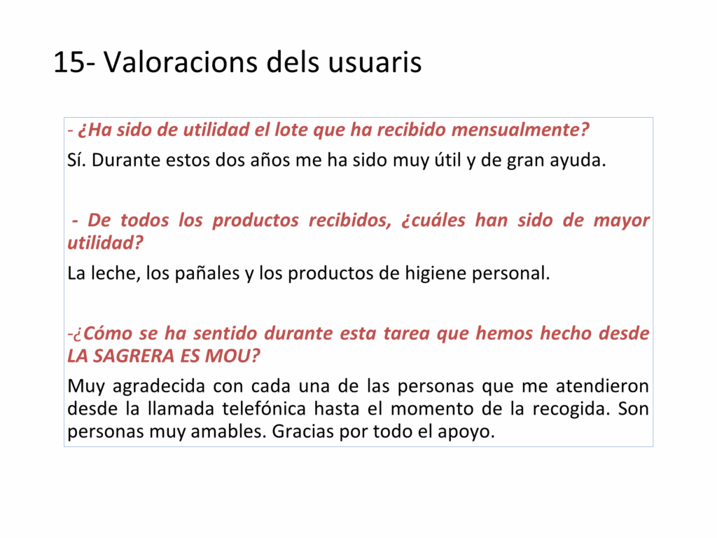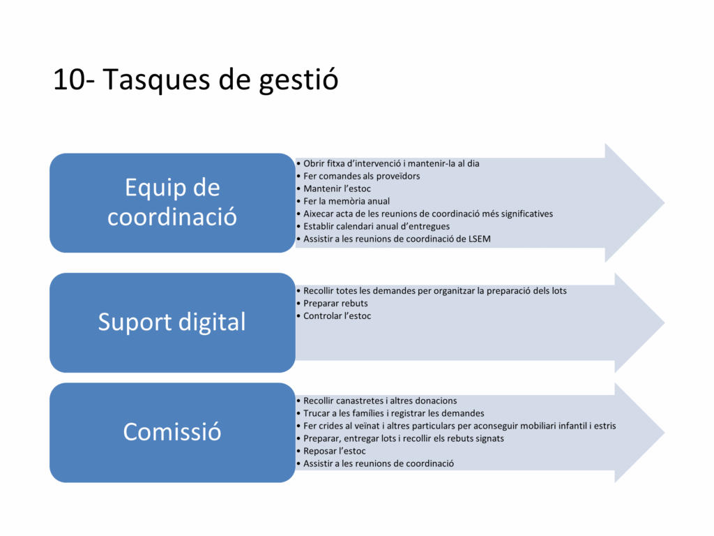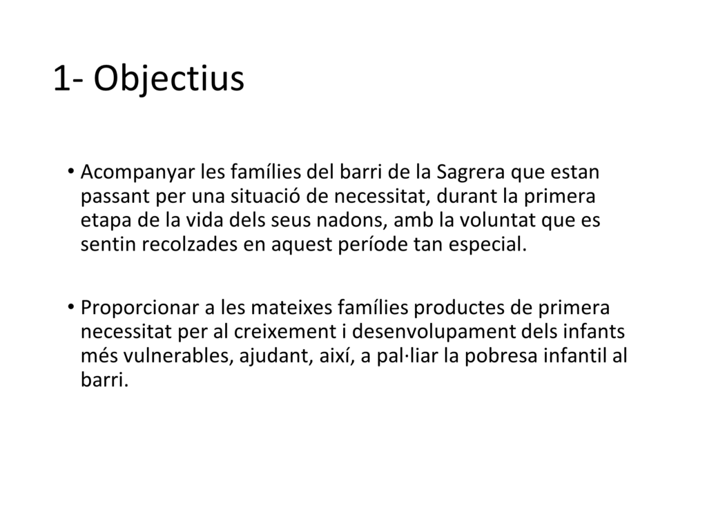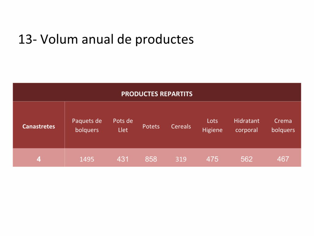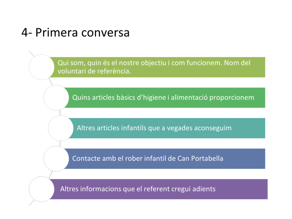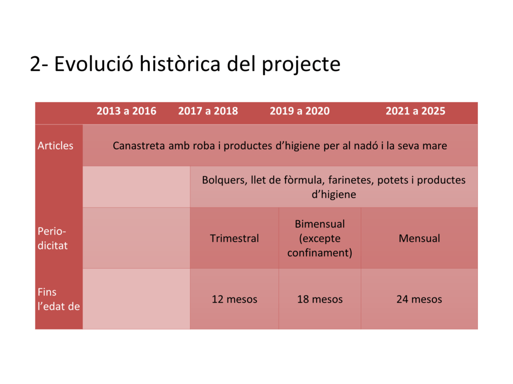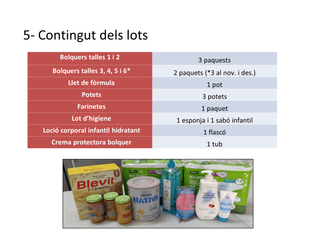 Proporciona, durant els 24 primers mesos de vida del nadó, productes de primera necessitat per al creixement i desenvolupament dels infants de famílies de La Sagrera que es troben en una situació de vulnerabilitat i derivades dels Serveis Socials de l’Ajuntament.