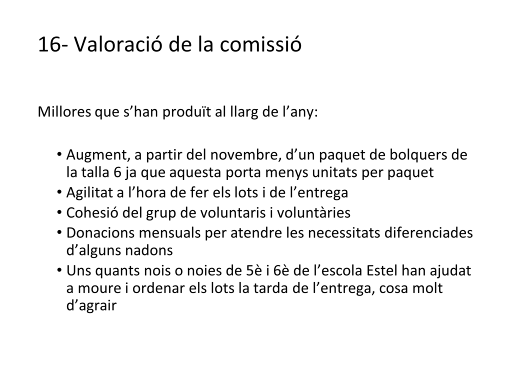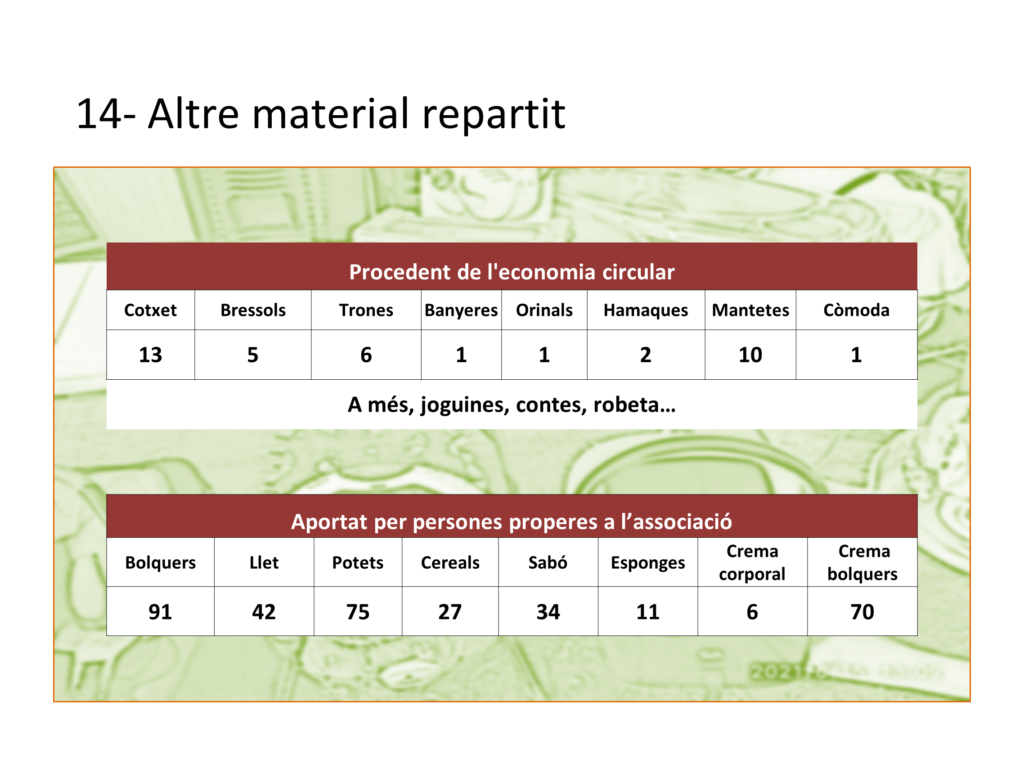 Col·labora amb Serveis Socials de l’Ajuntament amb projectes per a la criança d’infants i es recolza en altres entitats amb objectius complementaris: Projecte Nana, Solidaria Associació, Robers Solidaris, etc.